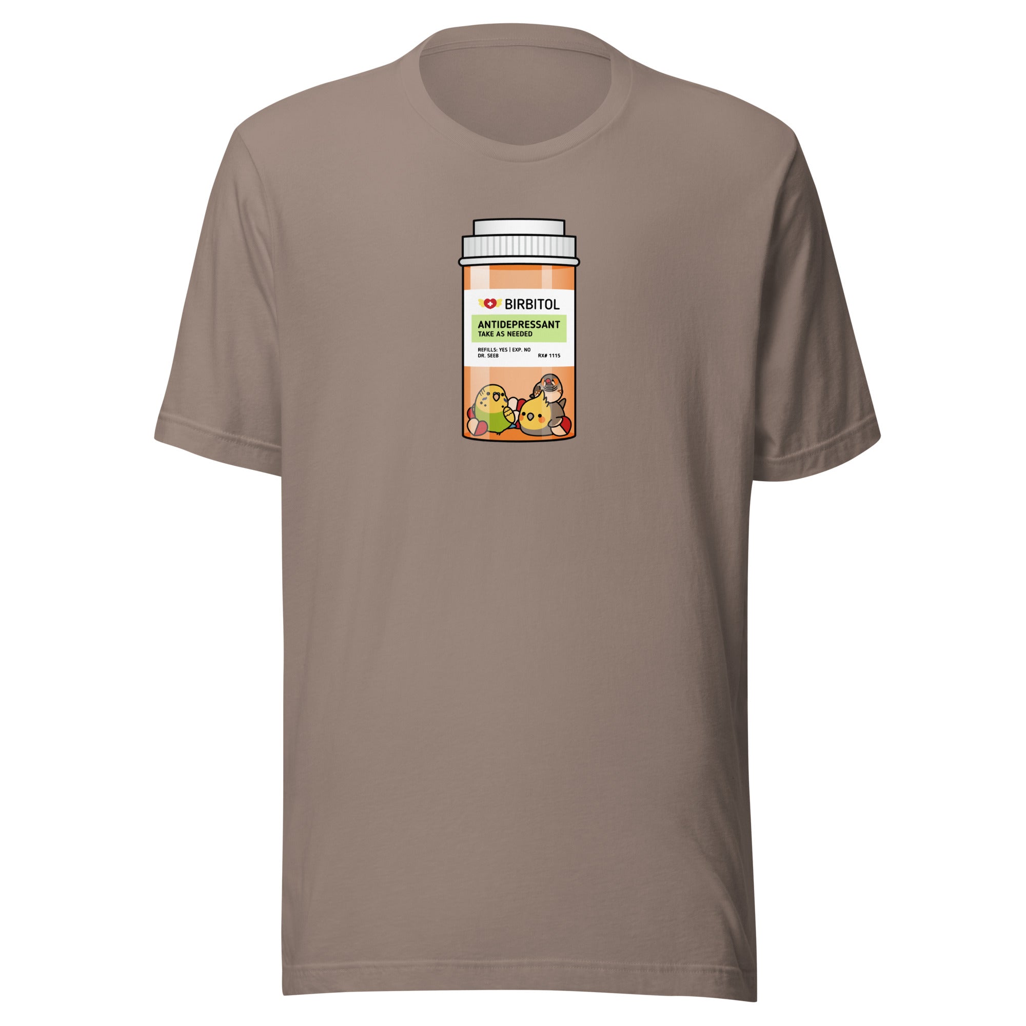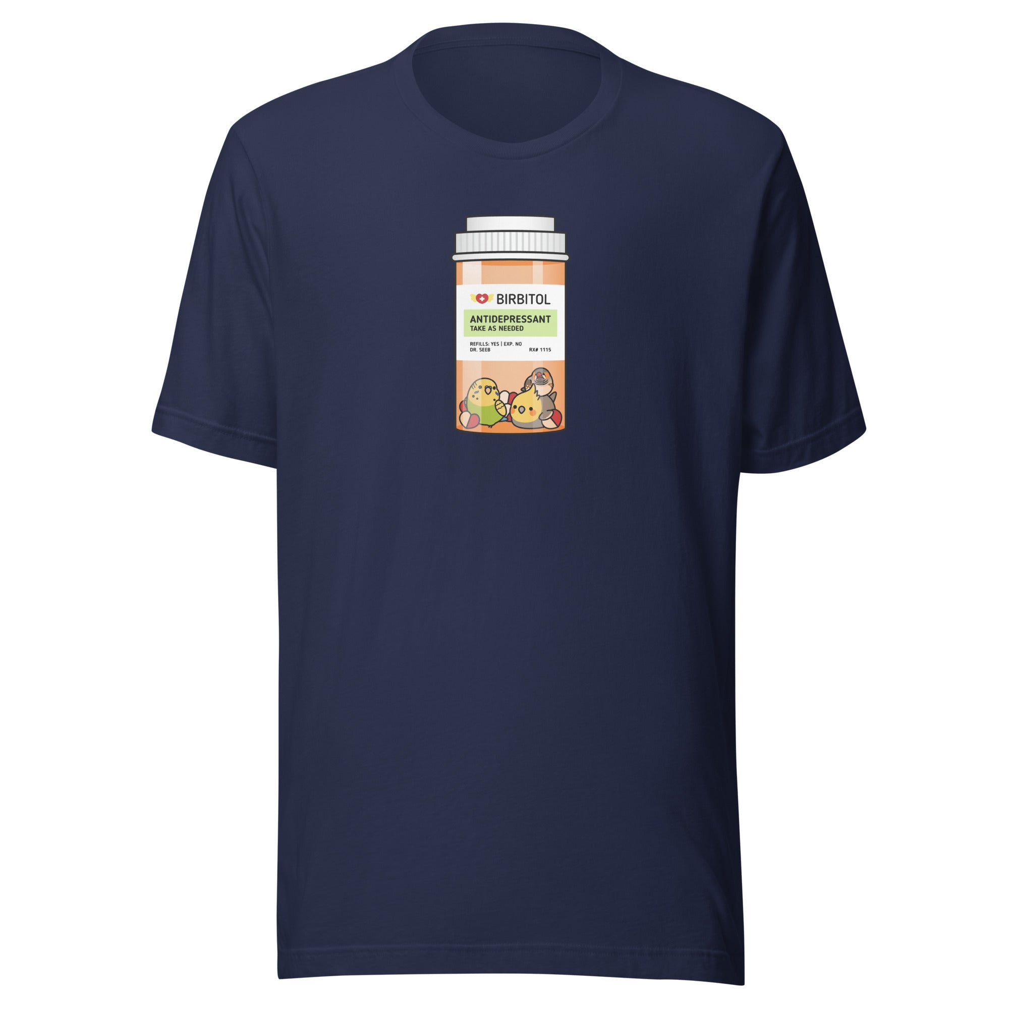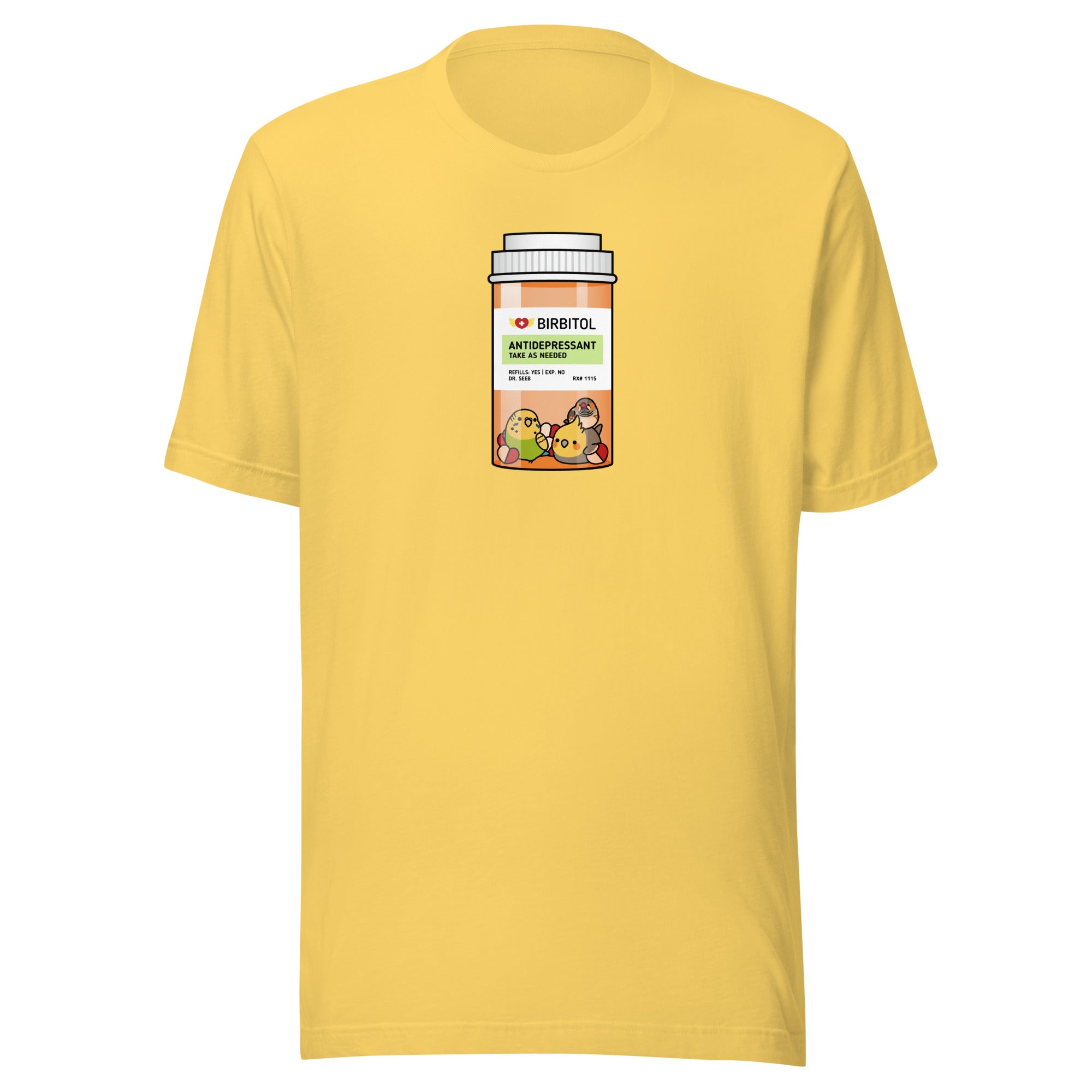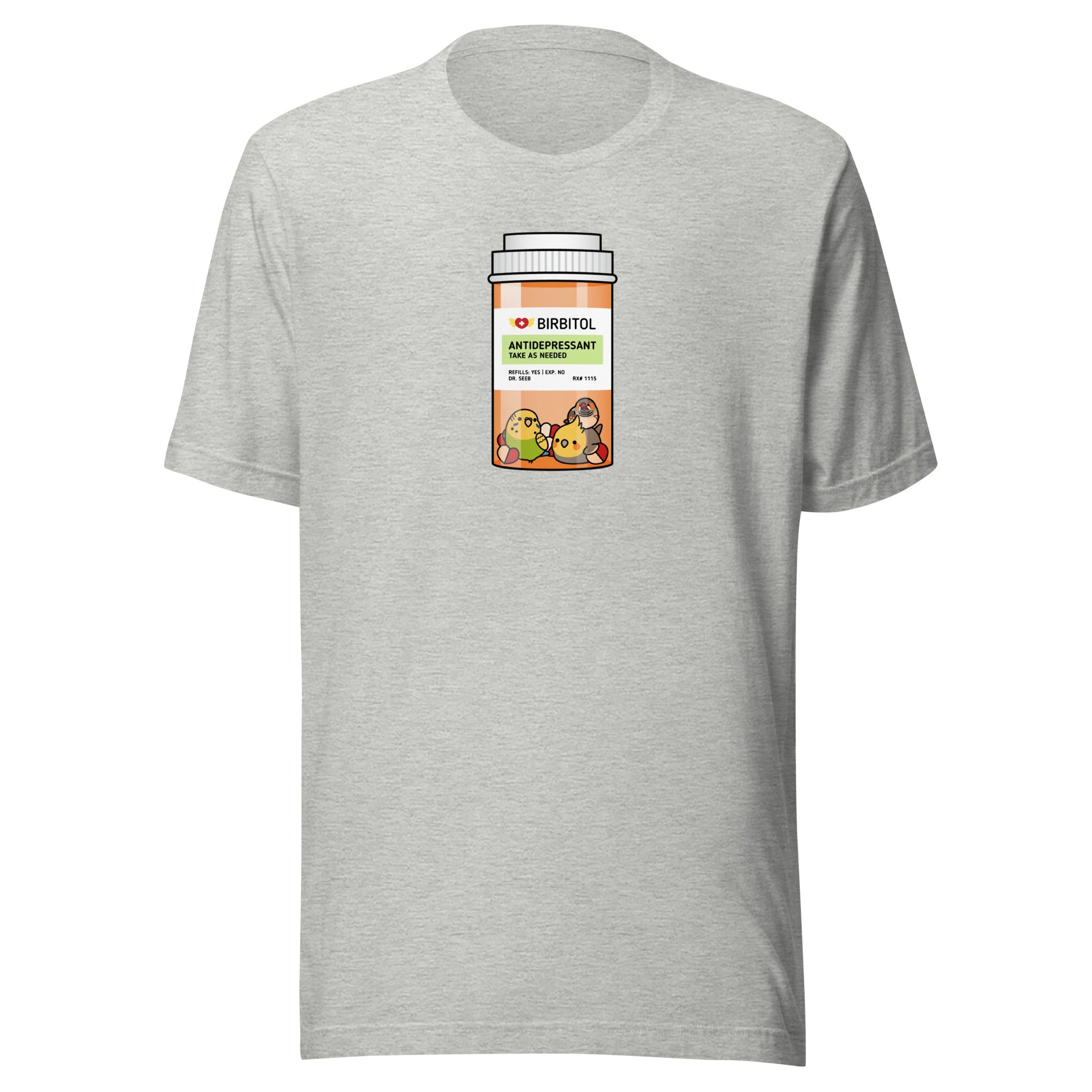 Alt Text: Cotton shirt with a picture of a green budgie, a male cockatiel, and a finch in a medicine bottle