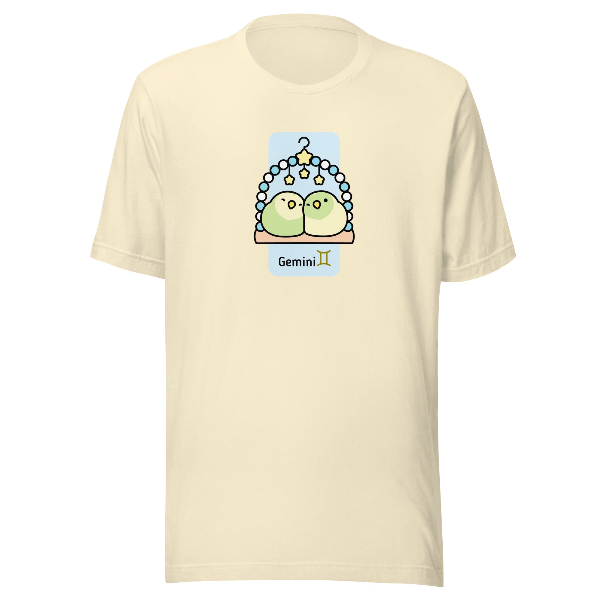 Alt Text: Cotton shirt with a picture of a pair of matching lovebirds snuggling together with "Gemini" written underneath