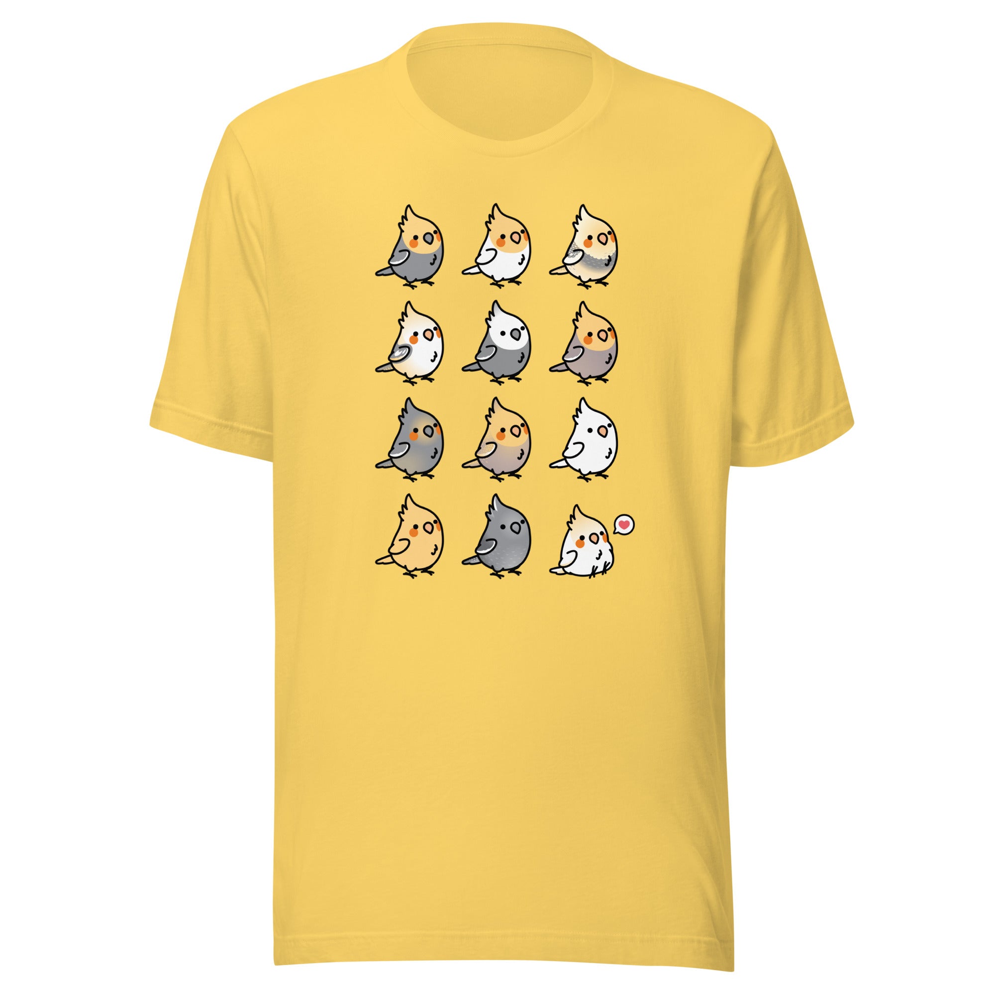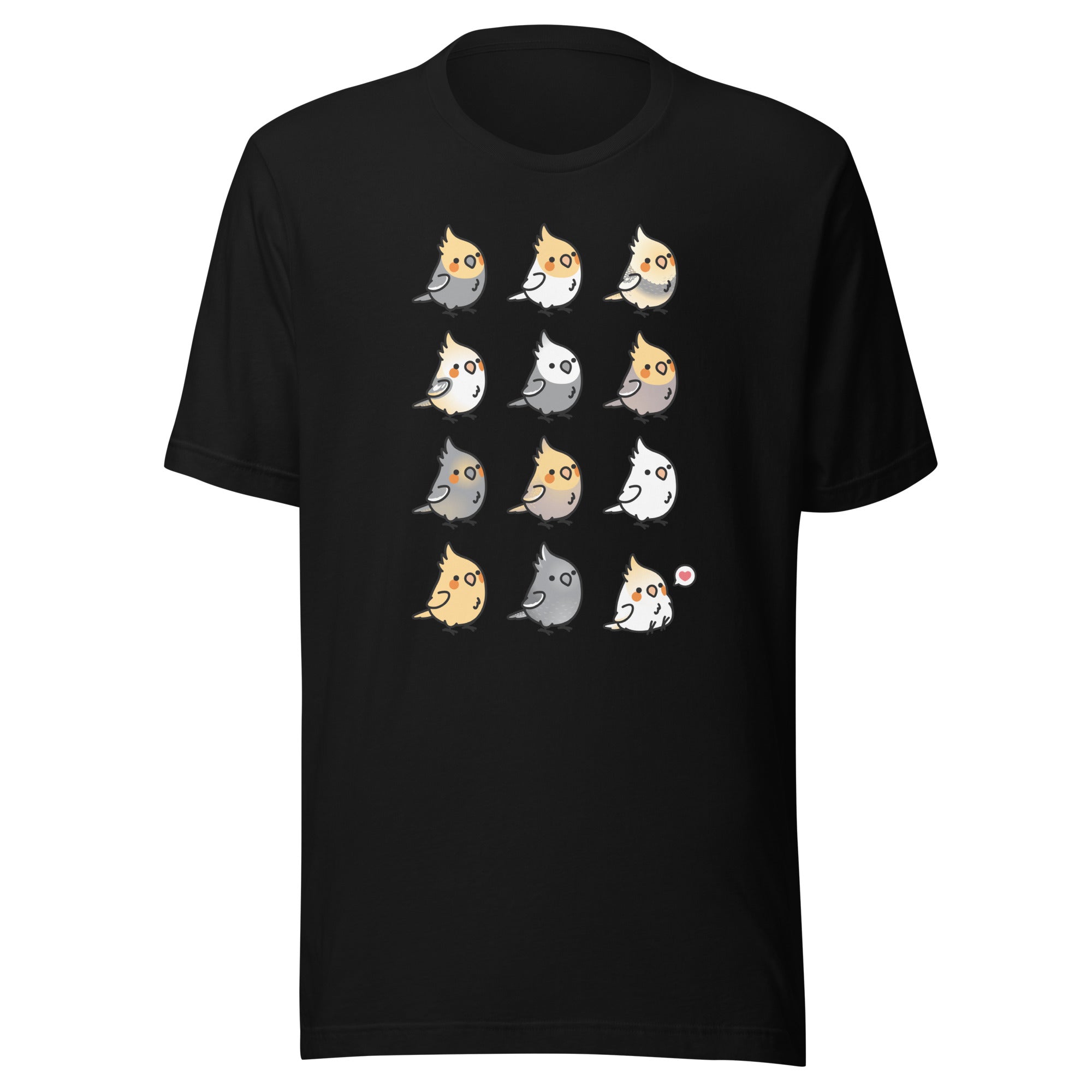 Alt Text: Cotton shirt with a picture of different colors and variations of cockatiels together