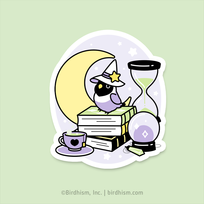 Alt txt: Sticker of Lolo the lovebird wearing a witch hat