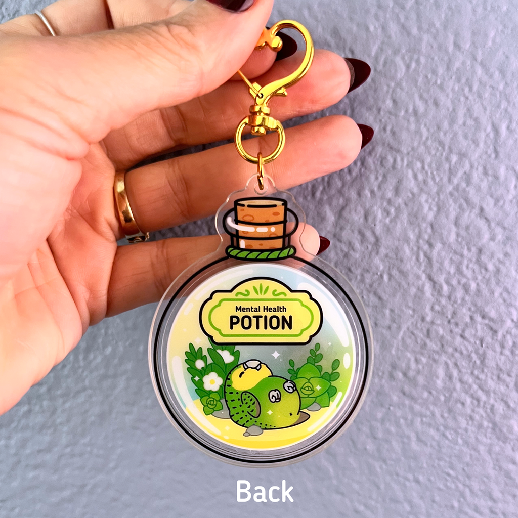 Alt txt: A kakapo laying on it's back in a potion bottle. The inside is like a green forest floor with the words mental health potion on top