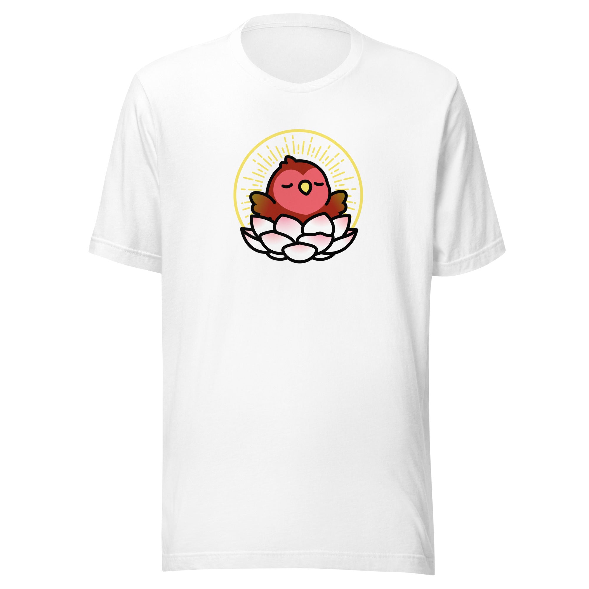 Alt txt: A cotton shirt with a picture of Cody the lovebird sitting in a lotus flower